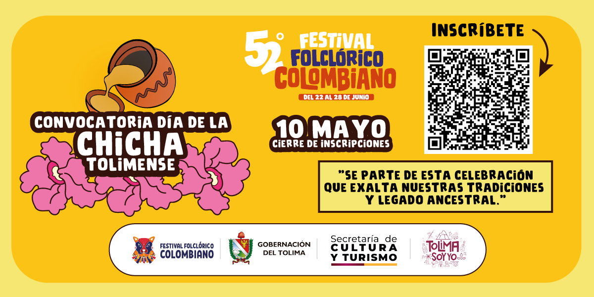 La directora de Turismo del Tolima Jennyfer Hernández hizo un llamado a los portadores de esta tradición para que participen activamente en esta celebración, “Es muy importante que se registren y nos compartan cuál es esa chicha especial que nos permitirá disfrutar, en el marco del Festival Folclórico Colombiano de los diversos sabores que enriquecen nuestra cultura”.